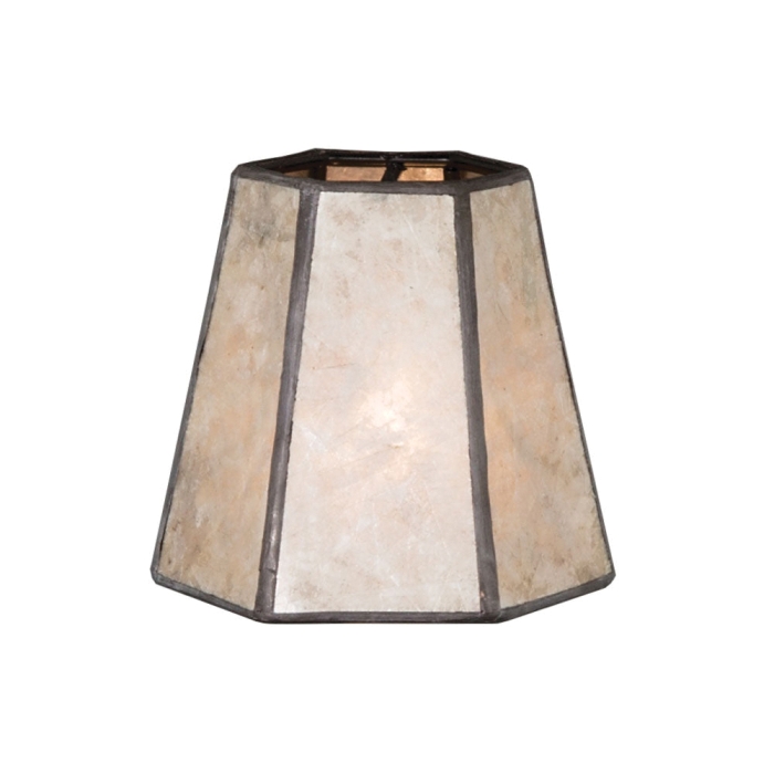 Parchment Color Hexagonal Shade with natural mica panels, antiqued brass frame, and topedo bulb clip fitter. Measures 2.5 inch top diameter, 4 inch bottom diameter, 3.75 inch height.