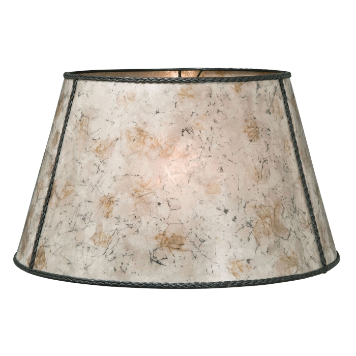 Onyx Color Empire Style Floor Lamp Shade - Mica. This Empire shades is made of Mica material with a copper foil frame trimmed in faux leather. Antique Brass Washer fitter. Fits 6", 8", and 10" I.E.S. Shades. Measures 13 inch top diameter, 19 inch bottom diameter and 11 inch height.