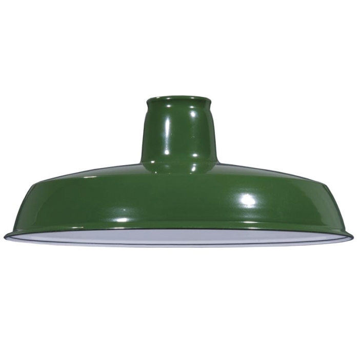 12 1⁄16 inch diameter Industrial Benjamin Style Metal Shade. Hand spun shade is 4 7⁄8 inch in height, has a 2 1⁄4 inch fitter and a durable white enamel inside, green enamel outside finish with a black edge trim.