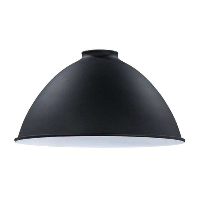 10" diameter Industrial Style, Metal Dome Lampshade with satin black outside, white enamel inside, and with small rolled outside bottom edge. 2-1/4" fitter, 5-1/2" tall