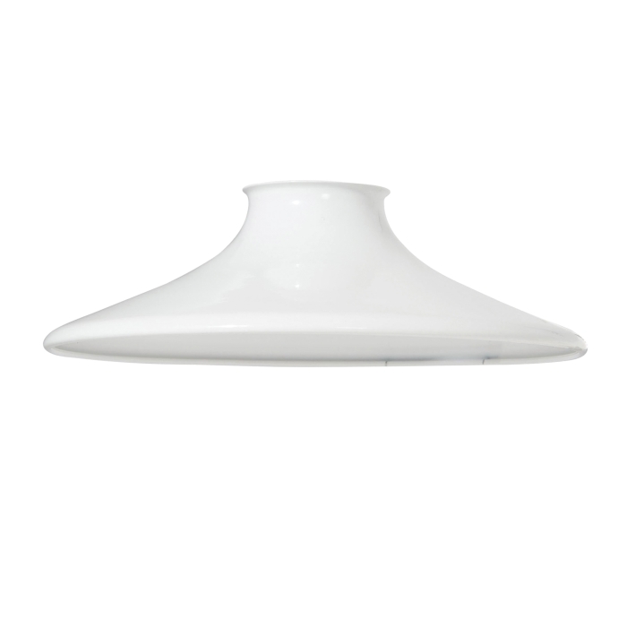 White enamel finish spun steel saucer shade. Shade has a small inside rolled edge.