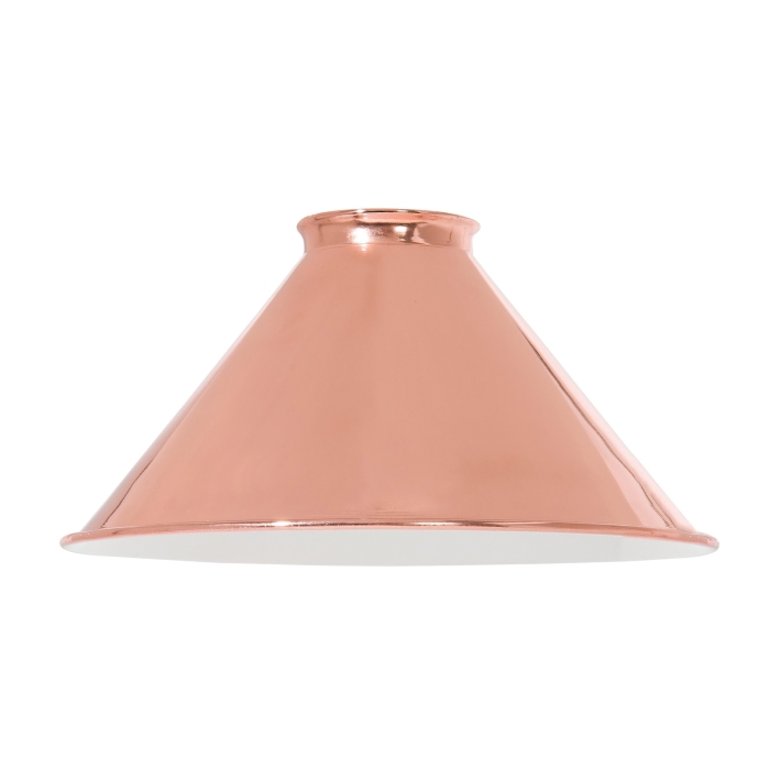 Spun steel polished copper finish cone shade - shade has a small rolled bottom edge. The inside has a white enamel finish.