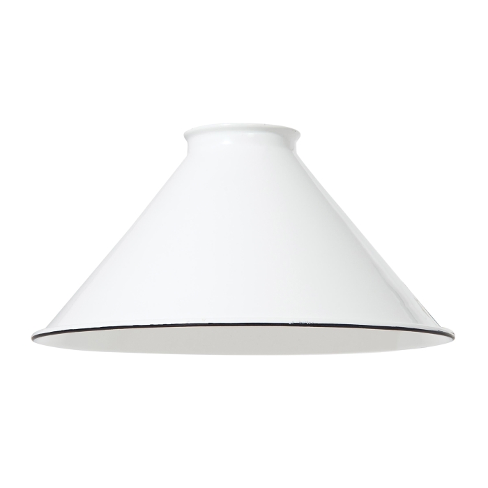 Spun steel cone shade, 2-1/4" fitter x 8" bottom diameter x 4" height, white enamel on the outside and inside, has a thin black border line, and comes with a small rolled bottom edge. These shades are a classic size and shape for pendant lights.