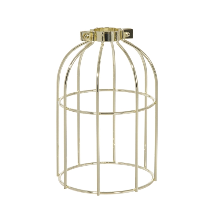 Brass plated finish steel wire bulb cage, clamp on socket type, 7.375" tall x 4.97" wide, clamps on to standard metal shell E-26 socket. Wire diameter 3.55mm.