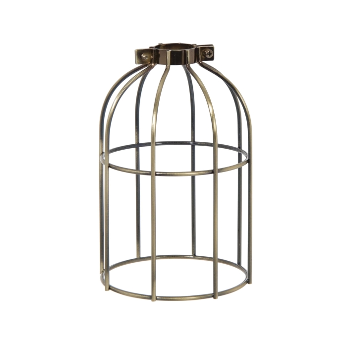 Antique brass finish steel wire bulb cage, clamp on socket type, 7.375" tall x 4.97" wide, clamps on to standard metal shell E-26 socket. Wire diameter 3.55mm.