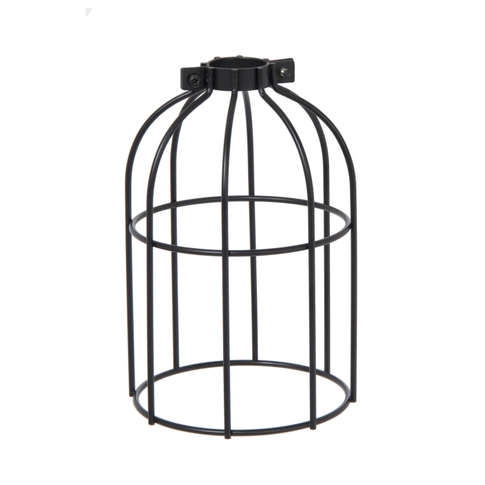 Satin black finish steel wire bulb cage, clamp on socket type, 7.375" tall x 4.97" wide, clamps on to standard metal shell E-26 socket. Wire diameter 3.55mm.