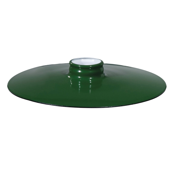 10 1⁄4" dia. hand spun industrial style flat metal shades with green porcelain enamel finish and black edge trim. 1 1⁄2" in height and have a 2 1⁄4" fitter