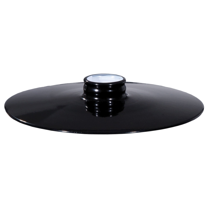 10 1⁄4" dia. hand spun industrial style flat metal shades with red porcelain enamel finish and black edge trim. 1 1⁄2" in height and have a 2 1⁄4" fitter
