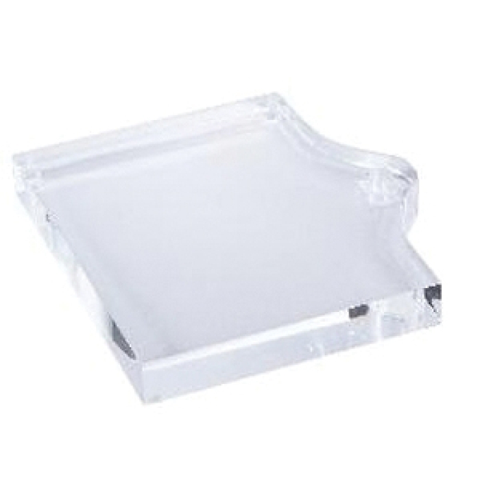 Footed, Rectangular acrylic base, 1" thick, with 7 /16" dia. counter sunk pipe hole, No wire way. Base has 4 clear feet. 6" x 8" x 13/16" ht.
