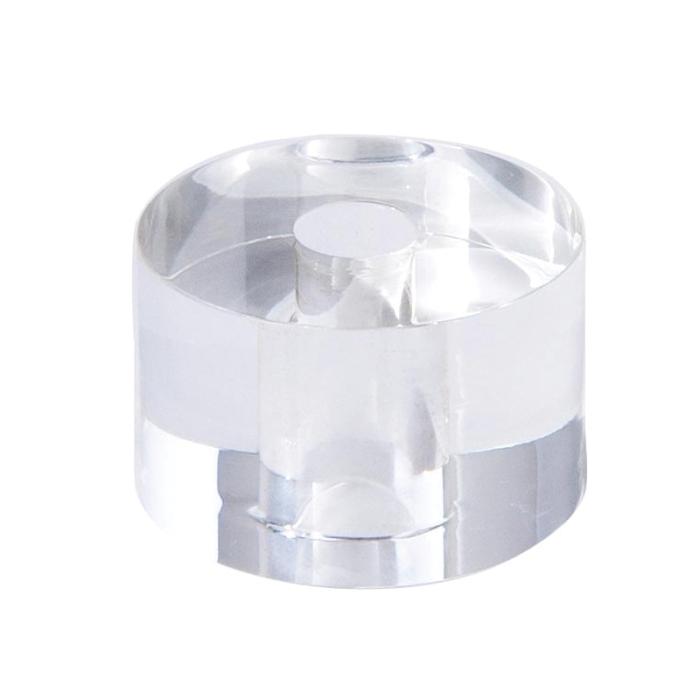 Clear and colorless acrylic cylinder-shaped lamp break, 1.5" diameter x 1" height. Break has a .438" diameter center hole with all surfaces and all holes polished clear. These lamp breaks are stackable and really open up the possibilities for mid-century modern lighting designs.