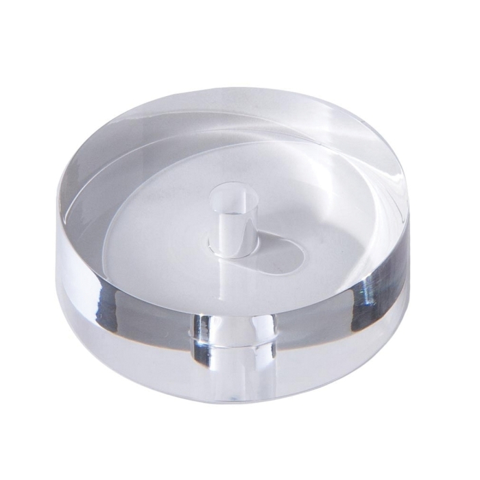 Clear and colorless acrylic cylinder-shaped lamp break, 3" diameter x 1" height. Break has a .438" diameter center hole with all surfaces and all holes polished clear. These lamp breaks are stackable and really open up the possibilities for mid-century modern lighting designs.