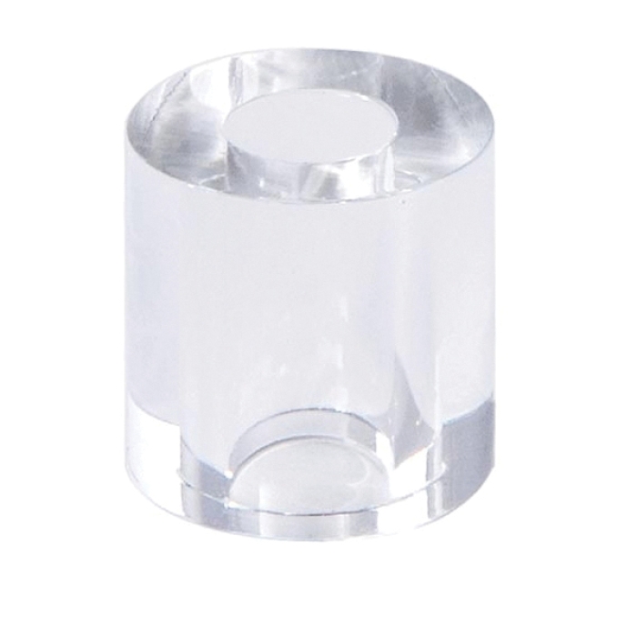 Clear and colorless acrylic cylinder-shaped lamp break, 15.16" diameter x 1" height. Break has a .438" diameter center hole with all surfaces and all holes polished clear. These lamp breaks are stackable and really open up the possibilities for mid-century modern lighting designs.