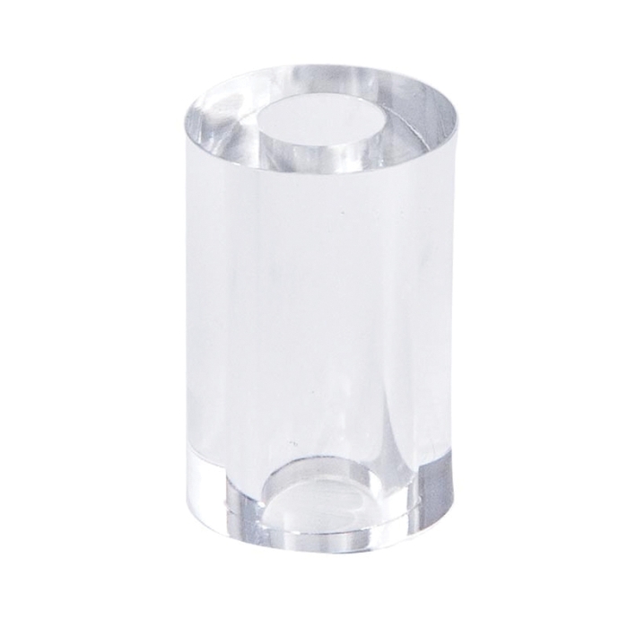 Clear and colorless acrylic cylinder-shaped lamp break, 15/16" diameter x 1" height. Break has a .438" diameter center hole with all surfaces and center hole polished clear. These lamp breaks are stackable and really open up the possibilities for mid-century modern lighting designs.