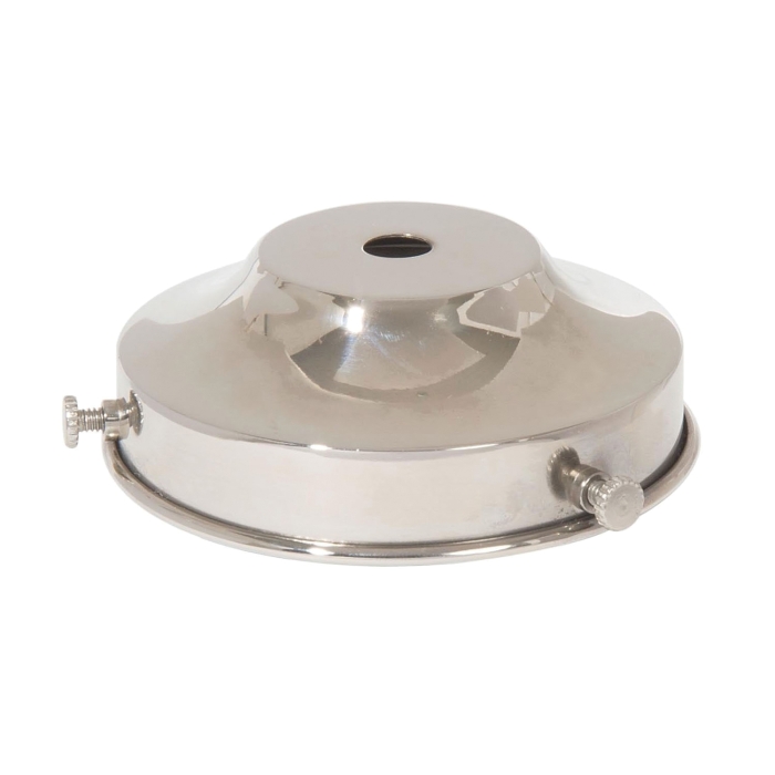 3-1/4" fitter, spun brass lamp shade holder, 1-1/8" tall, has 7/16" center hole that slips 1/8IP. Made with a sturdy gauge of material, this top quality lamp shade holder uses turned brass eyelets to properly mount the set screws. Polished nickel finish