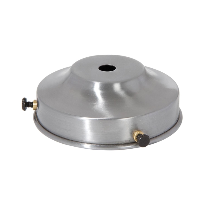 3-1/4" fitter, spun brass lamp shade holder, 1-1/8" tall, has 7/16" center hole that slips 1/8IP. Made with a sturdy gauge of material, this top quality lamp shade holder uses turned brass eyelets to properly mount the set screws. Unfinished Steel