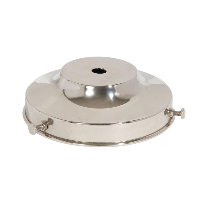4" fitter, spun brass lamp shade holder, 1-1/4" tall, has 7/16" center hole that slips 1/8IP. Made with a sturdy gauge of material, this top quality lamp shade holder uses turned brass eyelets to properly mount the set screws. Polished nickel finish