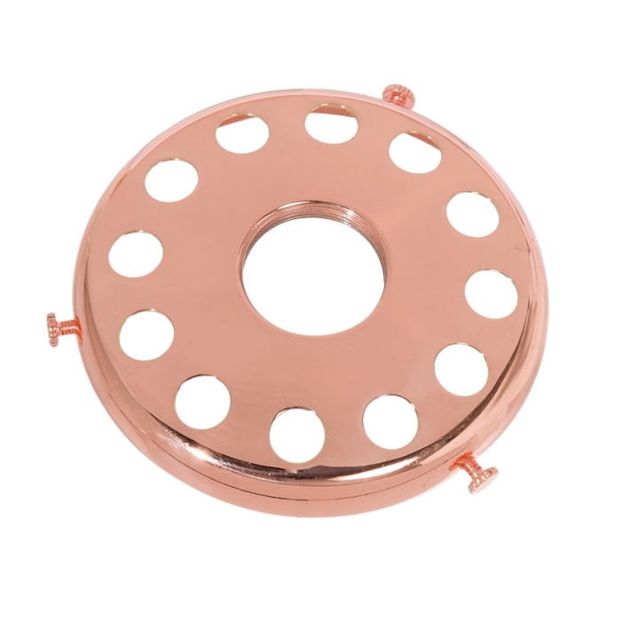 Polished copper finish solid brass shade holder. Shade holder is screw-on, UNO-type with solid brass "rosette" set screws.