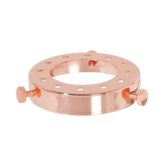 Polished copper finish stamped steel lamp shade holder with vent holes and matching screws.This shade holder fits our 2-1/4 inch fitter metal shades, and some glass shades. It also fits the socket holder 11656 series. Measures 2-3/4 inch fitter, 1/2 inch tall, 2-3/4 inch outer diameter and 1-11/16 inch inside diameter. Center hole is 7/16 inch diameter and slips 1/8IP.