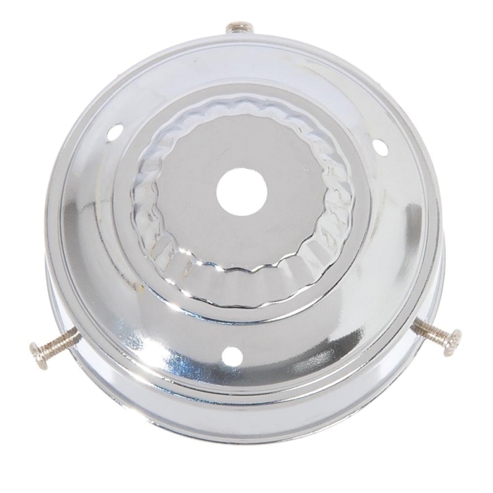 3 1/4" Fitter steel shade holders, 3.5" O.D., 1.5" tall, 3 set screws mounted in eyelets (8-32 x 1/2" long), three vent holes, rolled bottom edge, 7/16" center hole that slips 1/8IP. Chrome plated finish.