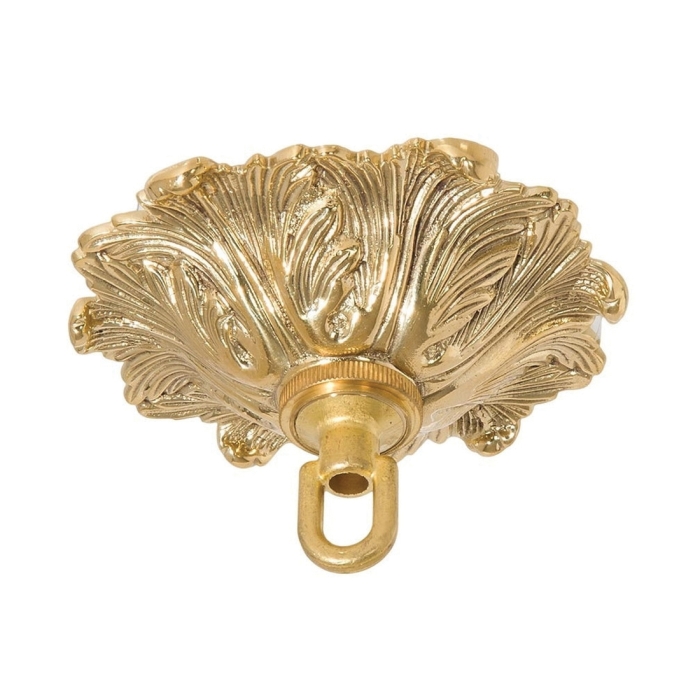 Unfinished die cast brass canopy comes with a screw collar mounting kit. Canopy has an ornamental petal shape.