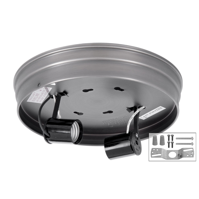 Wired, 8 Inch fitter Fixture Holder, 8 3/4 Inch diameter, steel, plated finish, U.L. listed. Accepts 8 Inch lip fitter shades. Comes with crossbar, wire nuts, thumb screws, etc. and includes 2 sockets, satin nickel finish