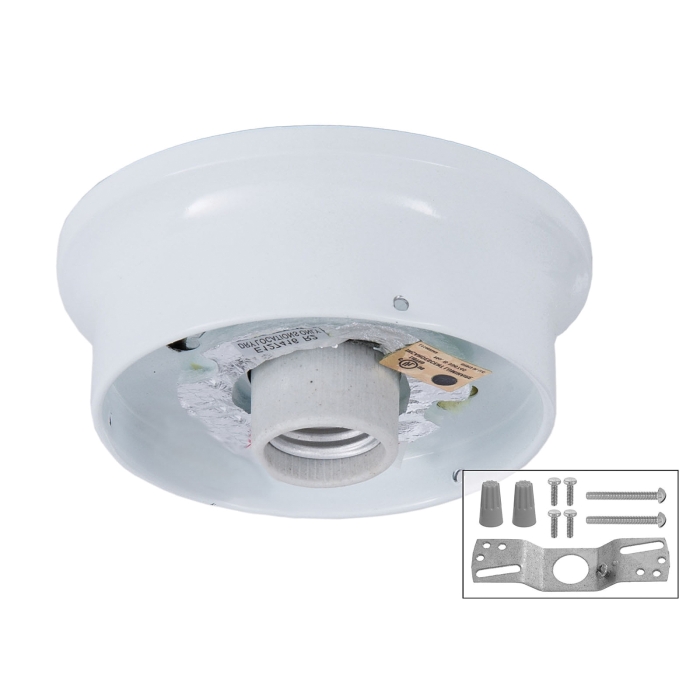 Wired, 4 inch fitter Fixture Holder, 5 inch dia., steel, plated finish, U.L. listed. Accepts 4 inch lip fitter shades. Comes with crossbar, wire nuts, thumb screws, etc. and includes high heat porcelain socket, white finish