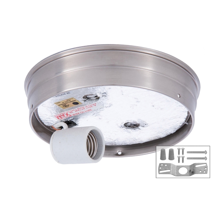 Wired, 6 Inch fitter Fixture Holder, 6 3/4 Inch diameter, steel, plated finish, U.L. listed. Accepts 6 Inch lip fitter shades. Comes with crossbar, wire nuts, thumb screws, etc. and includes high heat socket, nickel finish