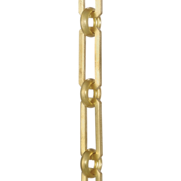 Hand made solid brass rectangular-shape chain with round joining links. The rectangular links measure 2-3/16" by 15/16" and are not soldered. Unfinished brass, price per foot.