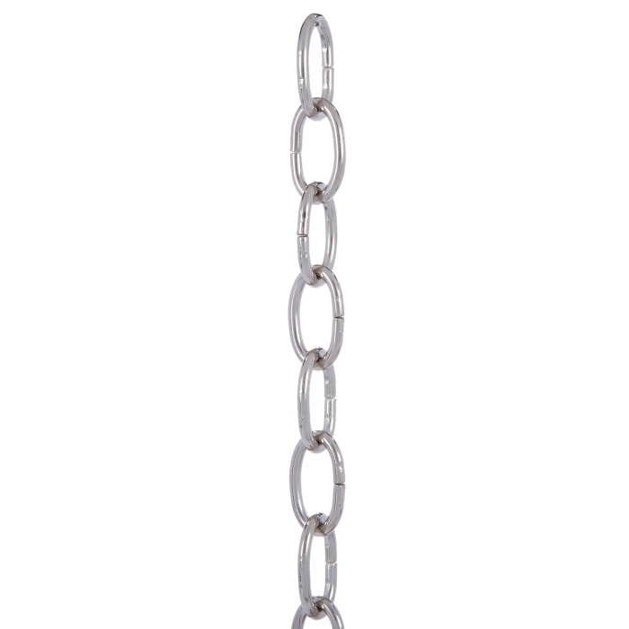5 gauge Heavy duty oval chain in 3 ft. lengths. Satin Nickel plated steel decorative lamp chain for medium-heavy service. Links are 1-9/16" x 1-1/16", .198" wire dia.
