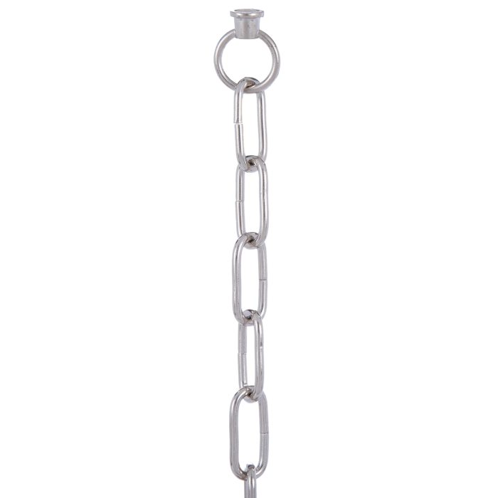 Nickel Plated Finish Straight-sided steel oval chain in 3 ft. lengths with Matching 1 3 /8" diameter, 1/8 IP Loops at Both Ends, Links are 2" x 7 /8", .211" wire diameter, side cut