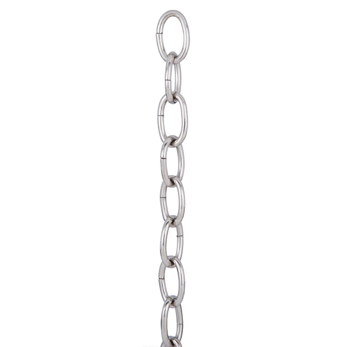 Nickel Plated Brass, Large Loop 5 Gauge Oval Chain. Sold and Priced per yardNickel Plated Finish 5 Gauge Solid Brass, Oval decorative lighting chain. Links are 1 5/8" X 1 1/16", wire diameter is .209" (side-cut). Sold per yard