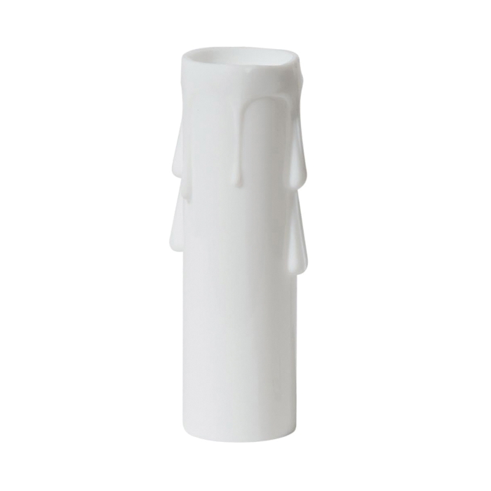 White colored plastic candelabra sized candle covers with drip details. Measures 13/16 inch inside diameter.