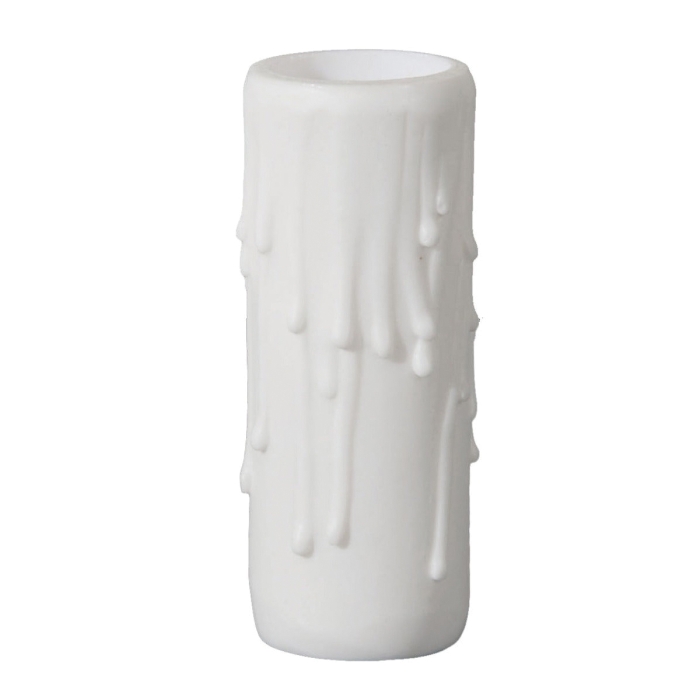 Flat White Color Polybeeswax Standard Candle Cover with long drips. Great look and color. These are made from a resin that looks and feels like wax. The are color fast and super sturdy. 4 inch length, 1.215 inch inside diameter.