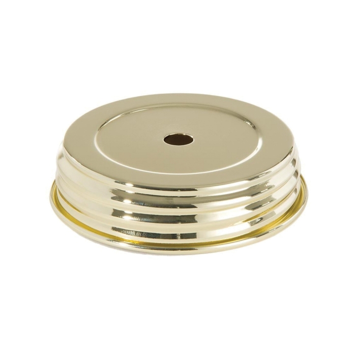 Heavy duty brass plated mason jar adapter lid. Mount the lamp socket of your choice to create a custom lamp using a wide mouth-size mason jar. 3-3/8 inch inner diameter base, top hole slips 1/8IP (3/8 inch).