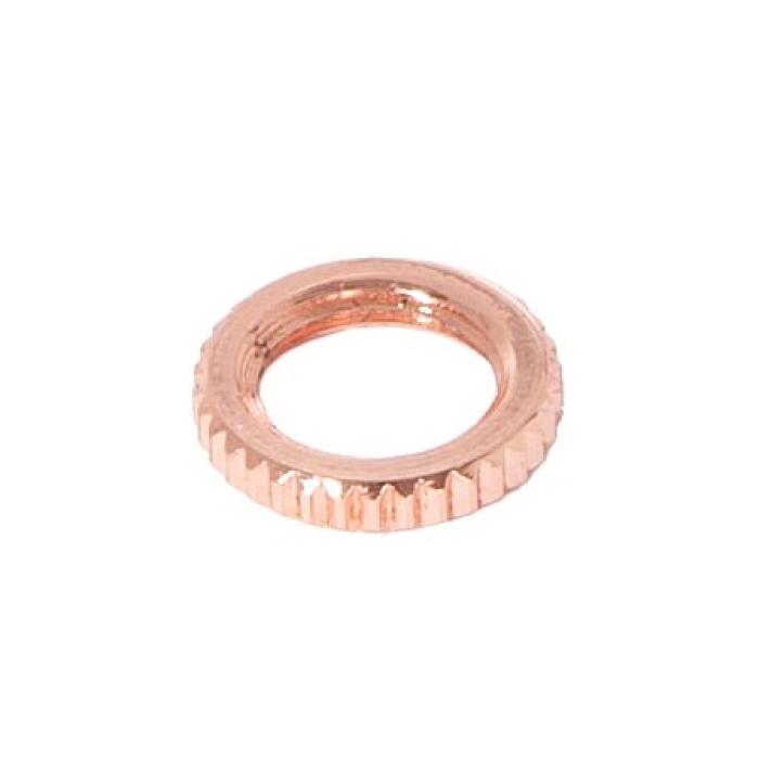 9/16" Outside diameter, polished copper finish knurled brass locknut, 3/32" thick. 1/8 F tap.