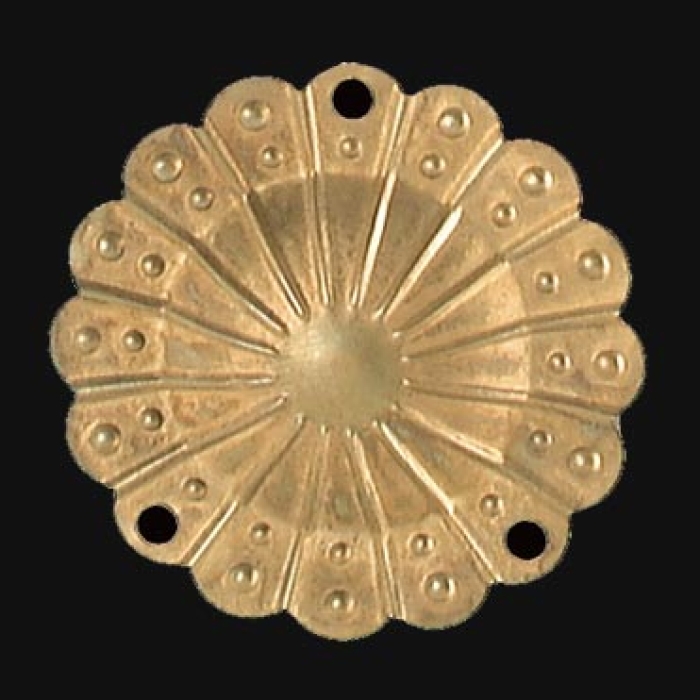 2 1/16" Stamped Brass Chain Connector Stamped Brass Chain Connector with embossed design. 2 1/16" diameter, with 3 chain connecting holes. Exact replica of an original Miller Library Lamp chain connector circa 1880. Solid Brass Unfinished.