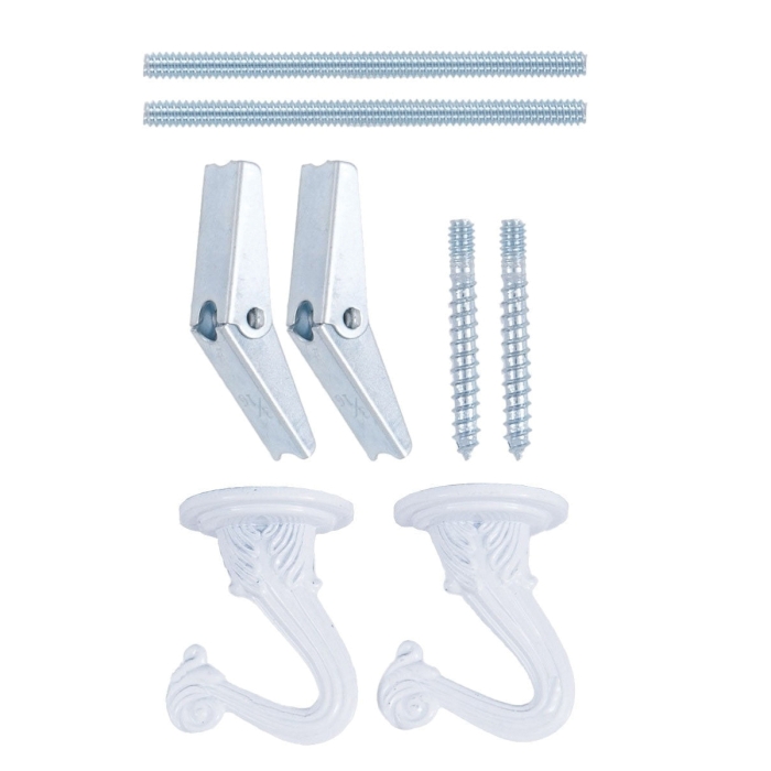 White 2 Hook Swag Lamp KitDie Cast Swag Hook Kit, contains 2 hooks with toggle bolt hardware for sheetrock and studs for wood mounting, 10 pounds max, white finish