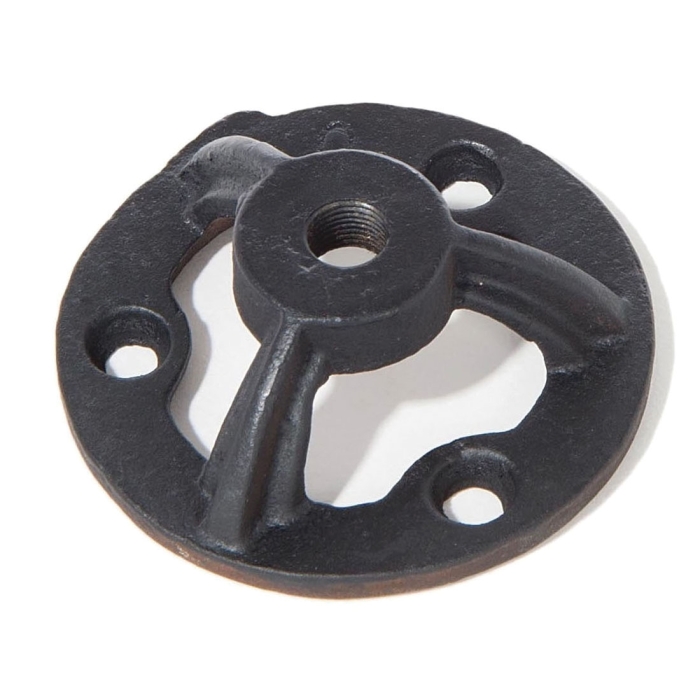 2-3/4" diameter cast iron mounting hardware bracket, 1" tall, has three countersunk mounting screw holes, center hole tapped 1/8F. Satin black finish.