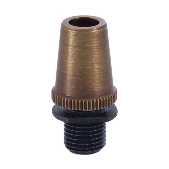 Antique Brass Finish Cord Grip Bushings for Twisted Pair & SVT-2 Plastic or Cloth Covered Cord 1/8 IP lamp cord grip bushing designed for plastic or cloth covered lamp cord. Great for pendant lighting where the cord attaches at the canopy, 1 1/8" long, 5/8" diameter. All bushings with brass body and plastic grip. Cord entrance hole I.D. =.29"