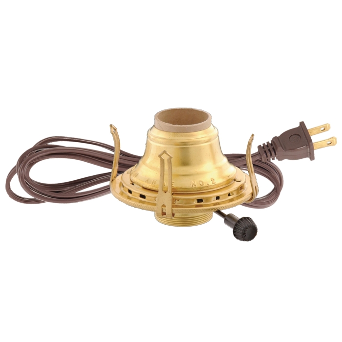 No. 2 Queen Anne Electrified Burner. Solid brass burner wired with U.L. listed parts & best quality 6 ft. lamp cord. Accepts a 3" base chimney. Burner is compatible with the following parts: