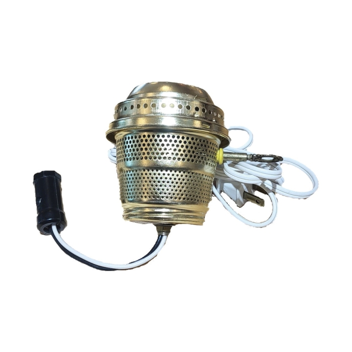 Solid Brass Electrified Burner* designed to fit Aladdin® Brand lamps and many B & P Lamp Supply lamps, assembled with U.L. listed components. 2" coarse thread base will fit most glass model lamps. Accepts a 2 5/8" regular or twist lock chimney. 6 ft. cord.