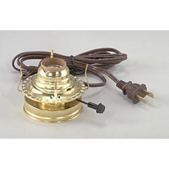 Mason Jar adapter, converts fruit jar into a chimney - fitting lamp. Brass plated burner and collar, electrified with U.L. listed parts with a 6 ft. clear silver cord. Accepts a 3" base chimney.