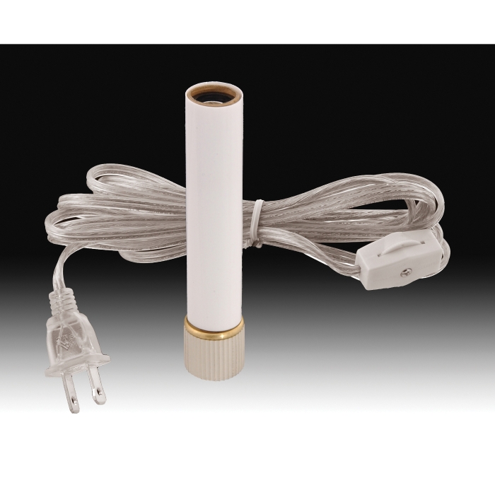 Complete 15/16" O.D. bottom Candlestick Kit, with 4" white candle cover, candelabra socket, 8 ft. silver cord with in line switch, U.L. listed components.