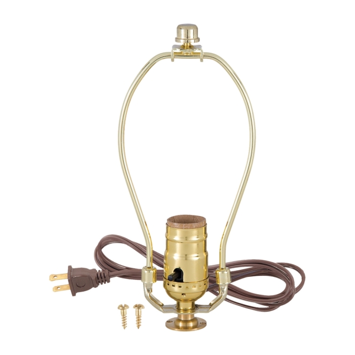 Make-A-Table Lamp Kit with turned brass flange & 2 wood screws for wooden lamp mount, 8 ft., 18/2 SPT-1 brown cord set, lamp harp, push thru socket with side outlet brass plated socket, nuts, washer, assembly instructions. Supplied w/U.L. listed components