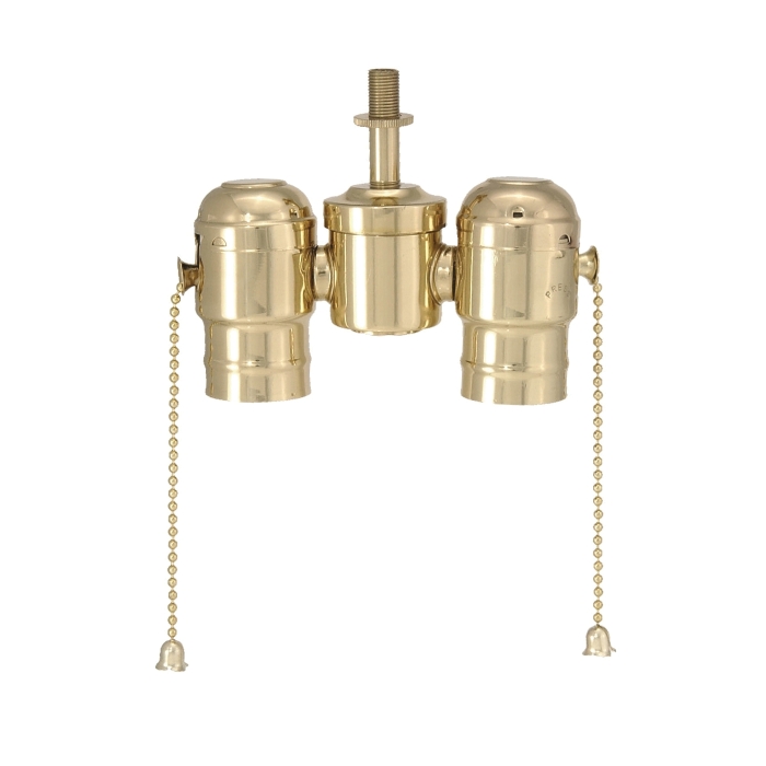 Polished & Lacquered Finish, Unwired 2-lite cluster with pull-chain swivel sockets - all solid brass. Tap 1/8F top X 1/4F bottom