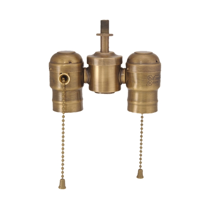 Antique Brass Finish. Unwired 2-lite cluster with pull-chain swivel sockets - all solid brass. Tap 1/8F top X 1/4F bottom