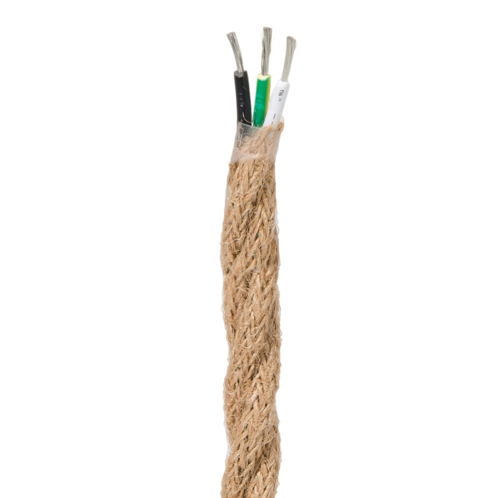 This special purpose, jute burlap-covered twisted lamp cord has 3 plastic covered insulated wires, each with a rayon sheath. Cord is 3 conductor, 12mm (3/8"") diameter, 18 gauge 105°C,600V. Sold per foot.