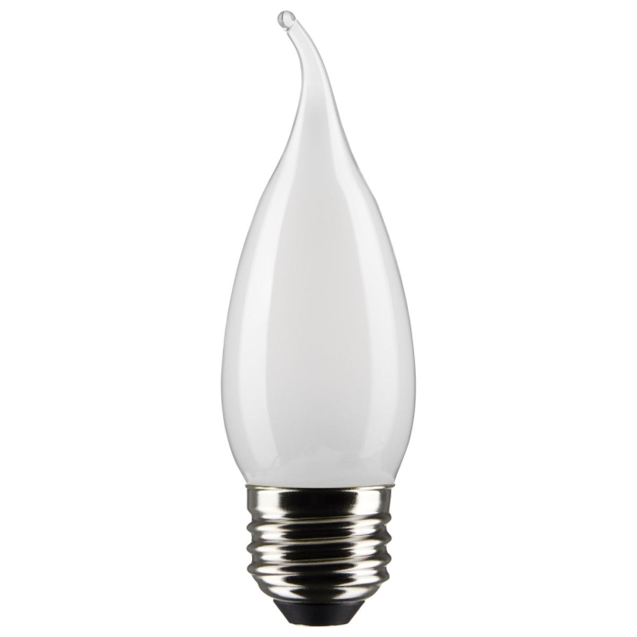 These LED light bulbs are a good size and shape for many hanging fixtures and sconces and serve as a good replacement for outdated incandescent bulbs. Frost, 40-watt equivalent (4W actual) medium base, E-26 LED CA10 dimmable bulb.15,000 hours, 120-volt, 350 lumen, 2700K, omnidirectional lighting.