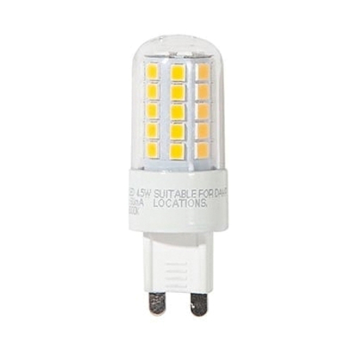 40 Watt equivalent LED light bulb with G9 base.This 3000K Warm White dimmable bulb produces 500 lumens using 4.5 watts. RoHS compliant.