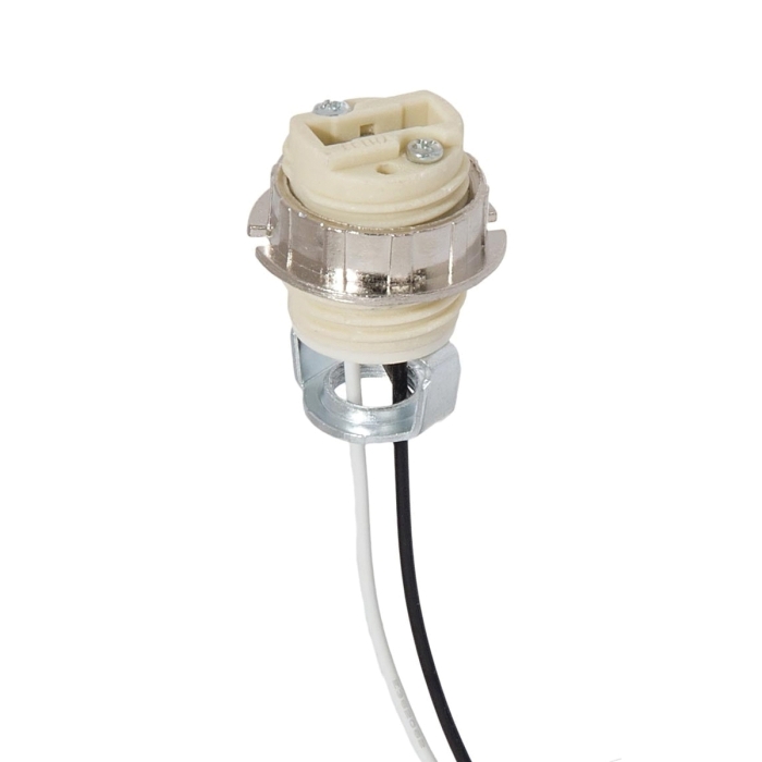 G9 external threaded porcelain socket with ring, 72" UL 10362 leads rated at 600V- 250°C, 1/8IP double leg hickey (3⁄8" tall) with internal extrusion, 1 3⁄8" height, 3⁄4" diameter, 500W-250V - 2 AMP. U.L. listed.<!47734>